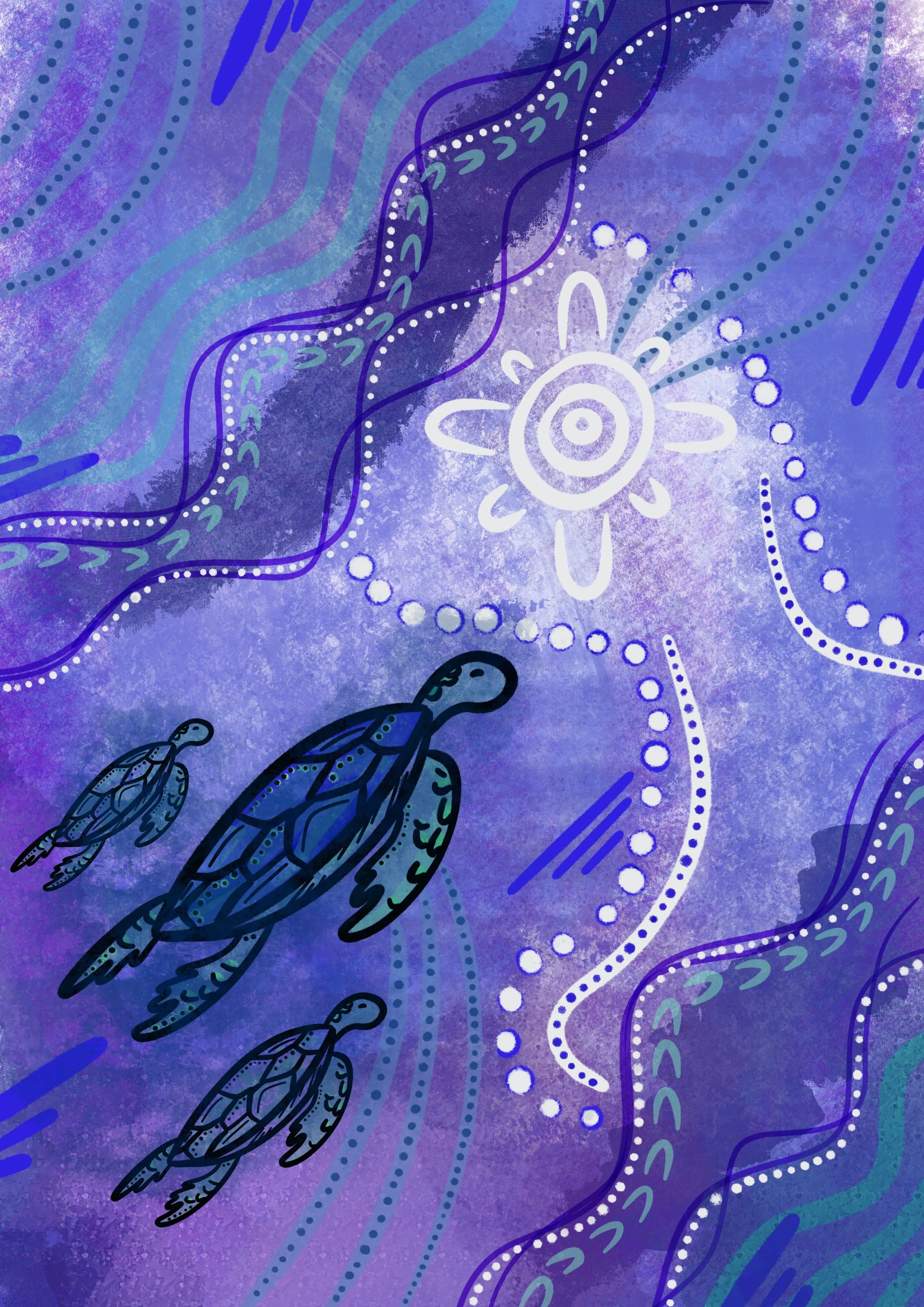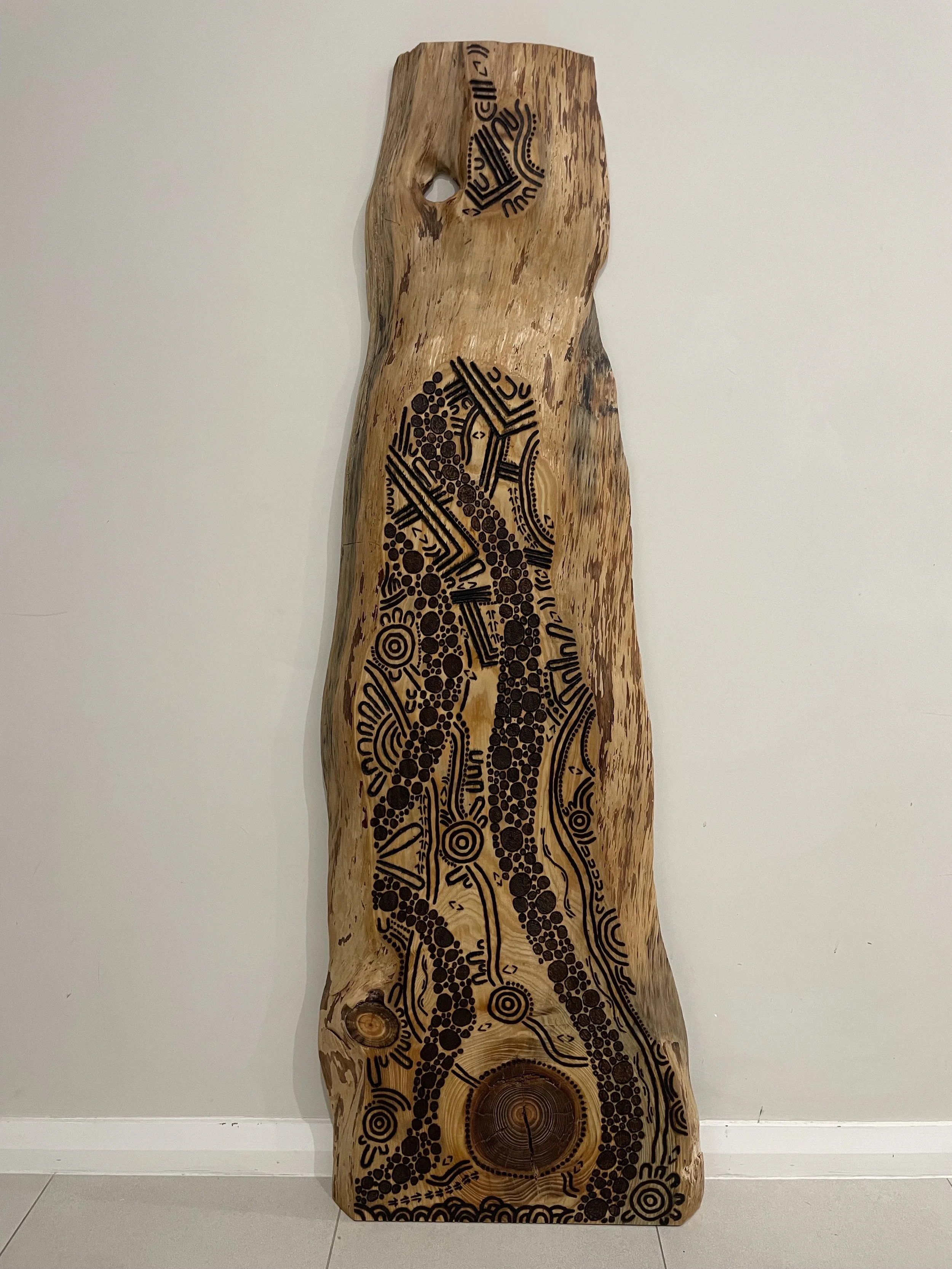 Piece of Wandoo Wood, Wood burnt, showcasing the story of my journey and the jounrey other young Indigenous people take reconnecting to culture and Country. Bought by RioTinto.